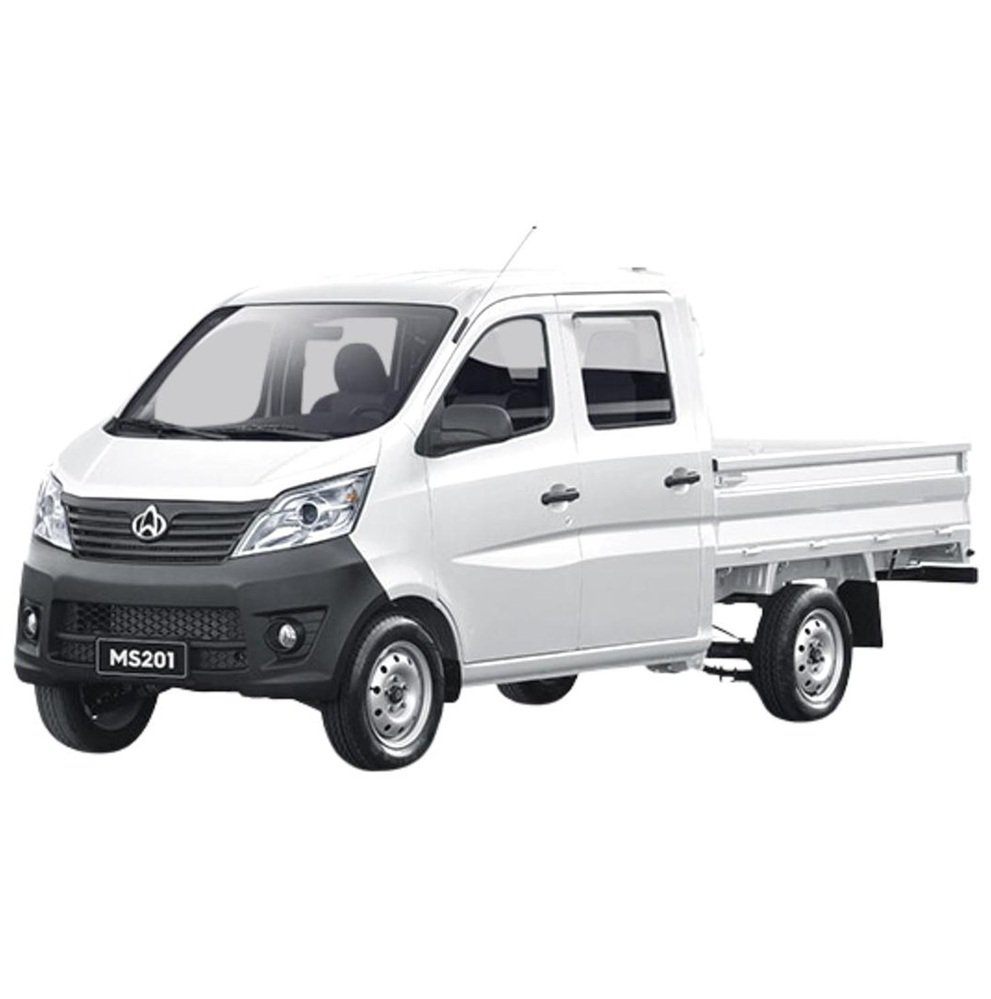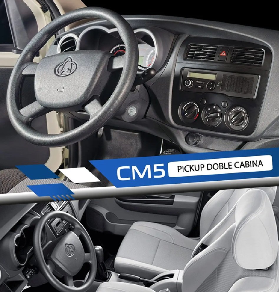 En el interior, la CM5 ofrece espacio para cinco pasajeros, con asientos revestidos en tela y alfombrillas incluidas. Está equipada con vidrios manuales, luz interna en la cabina y una toma de corriente de 12V, lo que aporta funcionalidad básica para el día a día. En términos de entretenimiento, incluye radio con función MP3, dos bocinas y una rejilla de seguridad. En el exterior, se destacan retrovisores abatibles, barandas traseras también abatibles para facilitar la carga y descarga, y llantas 165/70 R14, adecuadas para su uso mixto.