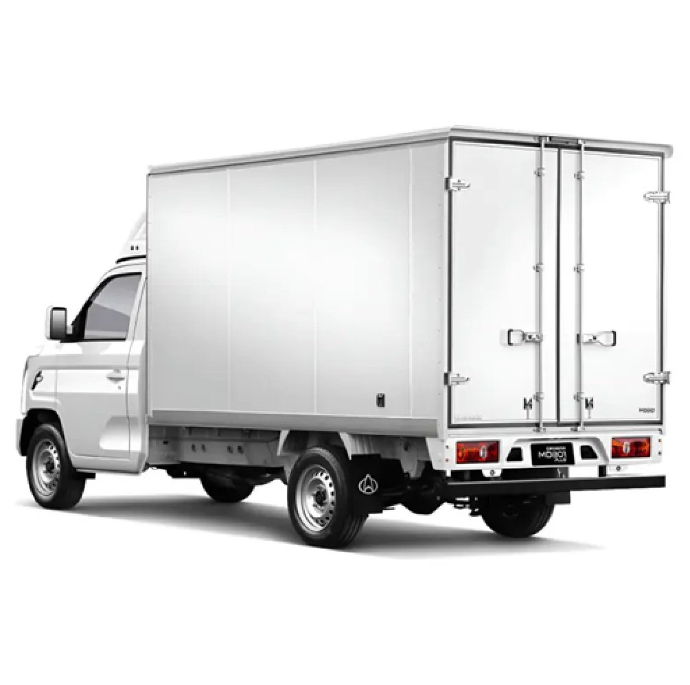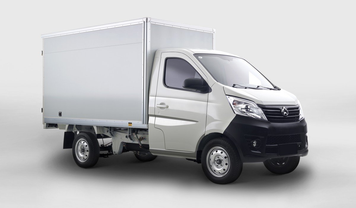 ofrece un equipamiento funcional enfocado en la eficiencia y comodidad del conductor. Su cabina sencilla cuenta con tapicería de tela resistente, apoya cabezas, tablero digital de fácil lectura, sistema de ventilación y calefacción, así como una radio con entrada auxiliar y MP3, acompañada por dos bocinas que brindan conectividad básica. Incluye también conexión de 12V, vidrios manuales, luz interna y una rejilla de seguridad para mayor protección de la carga. En el exterior, el vehículo incorpora retrovisores abatibles, barandas laterales rebatibles para facilitar el acceso a la plataforma, guardafangos, y llantas 165/70 R14 montadas sobre aros convencionales. También se incluye una llanta de repuesto con su respectivo aro y una tercera luz de freno para mejorar la visibilidad en carretera. Como valor añadido, Changan ofrece una versión opcional con furgón refrigerado, ideal para el transporte de productos perecederos o sensibles a la temperatura.